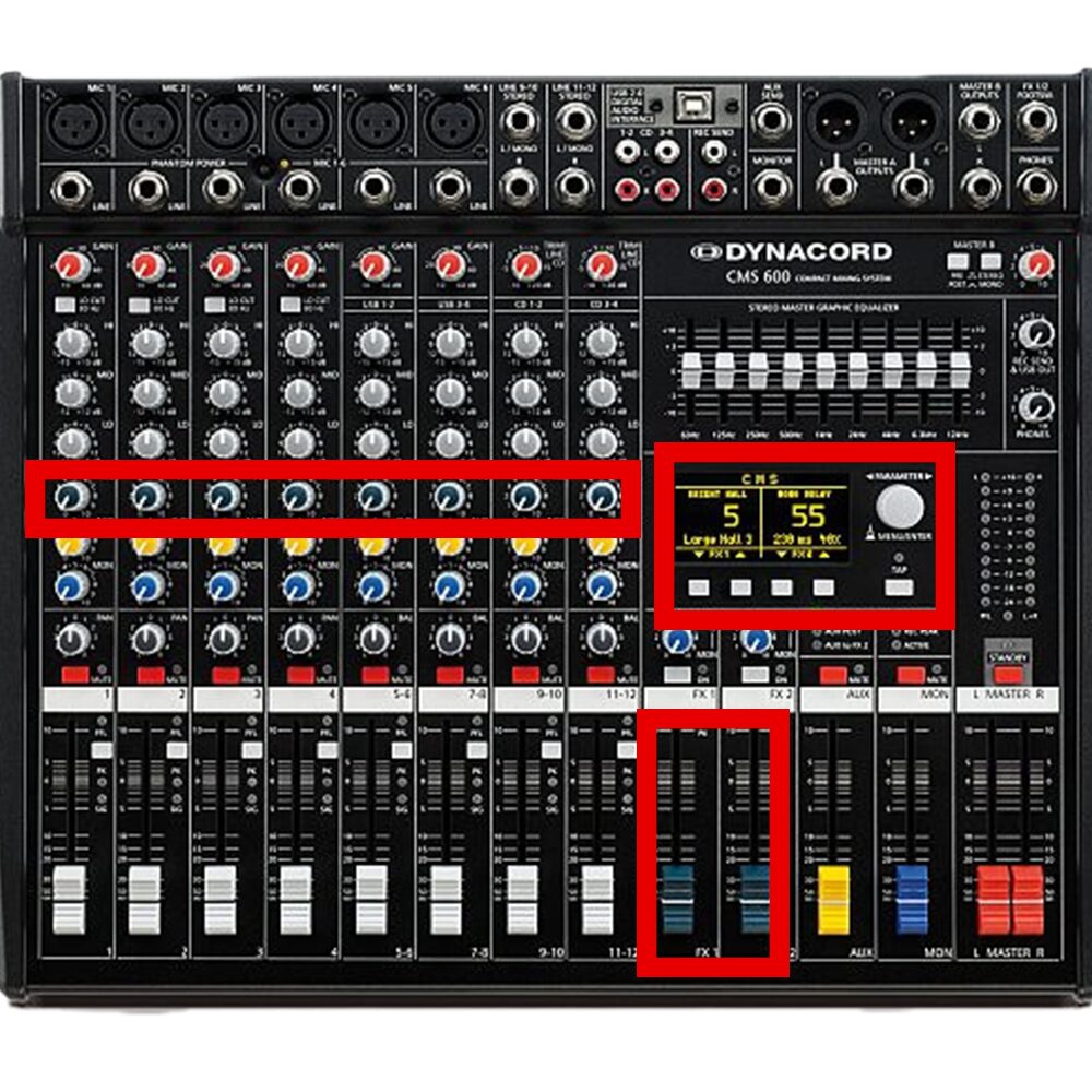Cách pha trộn: Đẩy fader FX1 và FX2 lên mức 0dB. Trên kênh Micro, vặn núm FX1 lên hướng 12h, FX2 lên hướng 10h.
