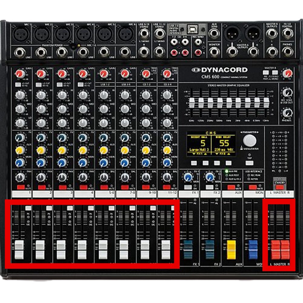 [HÌNH ẢNH: Chụp hệ thống Fader tổng và Fader từng kênh](